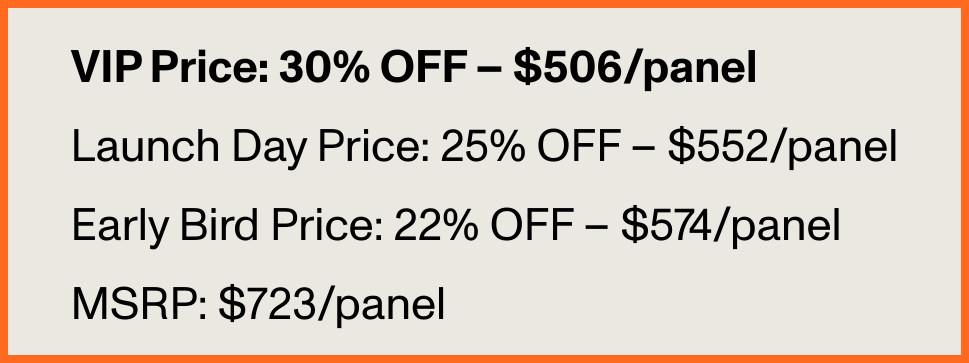 Just $5 unlocks our VIP price of 30% off at just $552 ($750 CAD) per panel ($723 MSRP), first-in-line shipping, and early access on launch day!